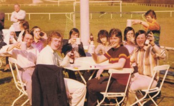 Um den Tisch von vorne links (dunkles Sakko über dem Stuhl) linksrum: Hans Jürgen Kienle, Werner Zimmerer, Fritz Sieber, Helmut Gutknecht, Claus Schummer, Toni Stebich, Karl Heinz Schies, Dieter Jasper, Gerhard Knor Hinten links: Christa Stauß mit Vera und Erwin Lang Trainer und Fotograf: Manfred Stauß